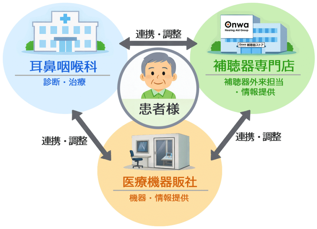 診断・治療・検査は医療機関、補聴器のフィッティングは専門店という役割分担のもと、経過のフィードバックや再受診のご案内を行い、安全で継続的な支援体制を構築しています。